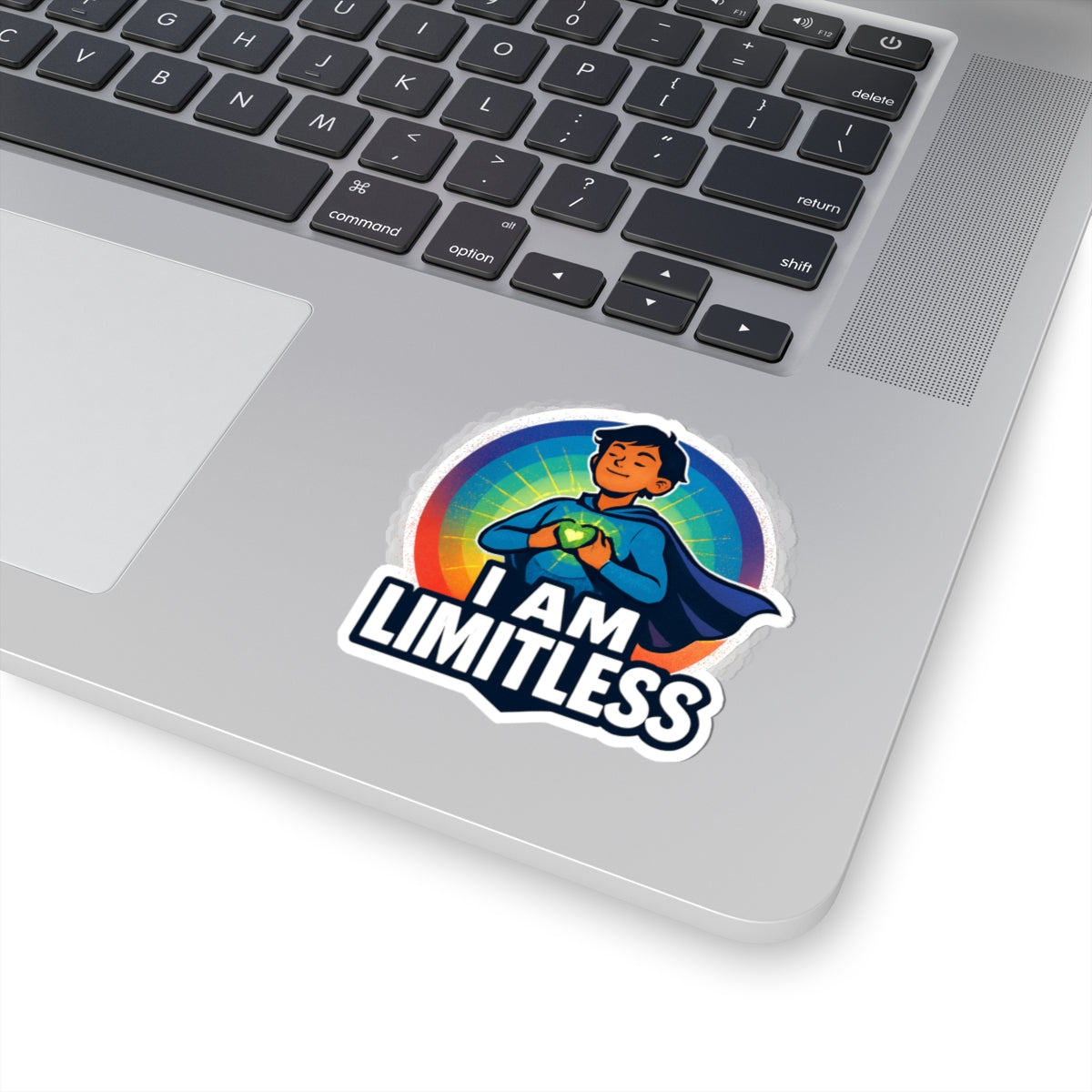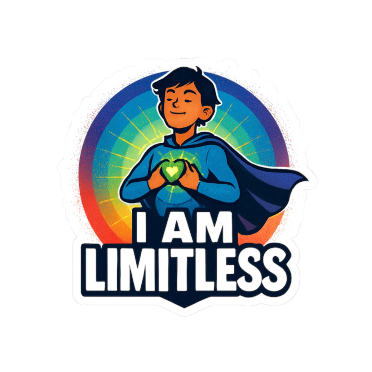 Bright, bold, and full of heart — this kiss-cut sticker celebrates quiet confidence. A youthful superhero clasps a glowing heart at their chest, framed by a radiant rainbow halo and the uplifting declaration: I AM LIMITLESS. The glossy finish makes colors pop on laptops, journals, water bottle lids, or any smooth flat surface where a small boost of courage belongs. Lightweight and durable vinyl holds a permanent acrylic adhesive for long-lasting placement, while crisp cut lines keep the design looking clean and intentional. Choose white or transparent backing and one of four sizes to fit the spot where you want to carry this little reminder of strength and possibility.