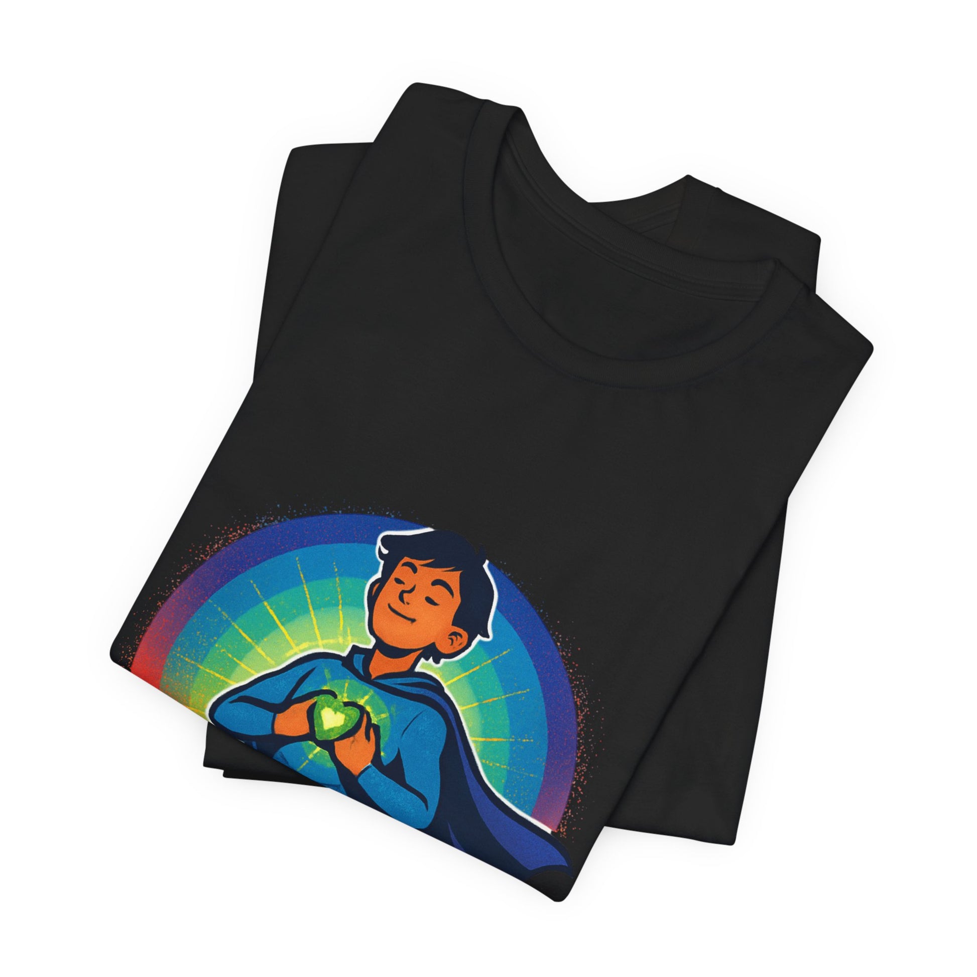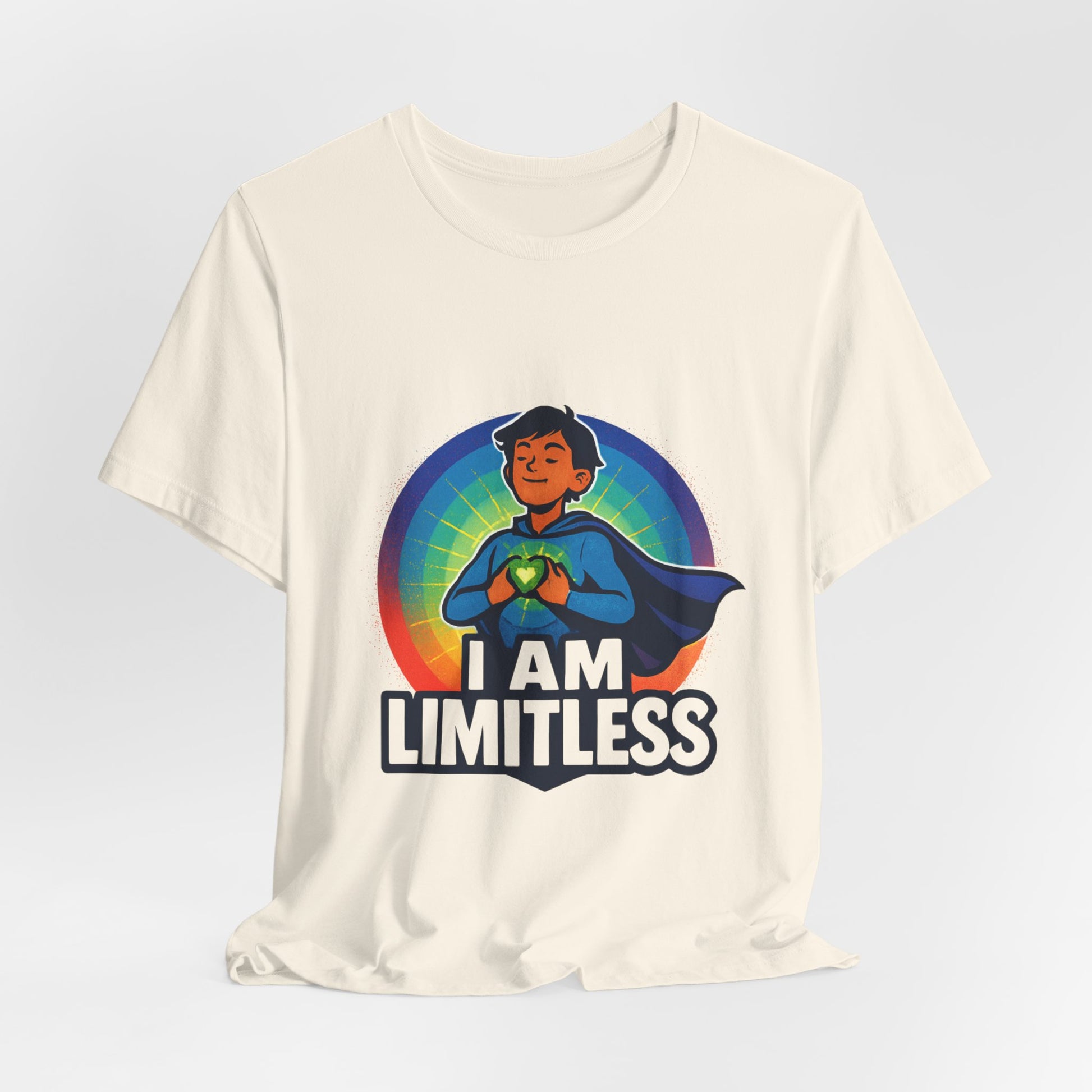 A soft, breathable jersey tee that carries a bold message—'I AM LIMITLESS'—printed over a confident, cape-wearing figure framed by a vibrant rainbow halo. Lightweight Airlume combed ring-spun cotton gives it a smooth, comfortable hand and a flattering retail fit that layers easily under jackets or stands alone. The graphic’s crisp colors and sharp edges pop on the white fabric, making the statement clear from across the room. Wear it to boost your mood, remind someone they matter, or bring uplifting energy to casual outings and community events.